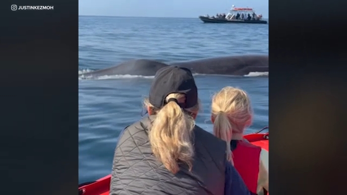A family's weekend boating trip in Newport Beach turned into a once-in-a-lifetime experience after a massive fin whale surfaced right next to their boat.